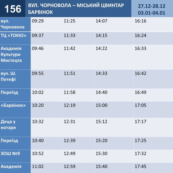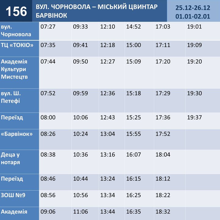 Графік маршруту №156 на 27-28 грудня та 3-4 січня. Ужгородська міська рада