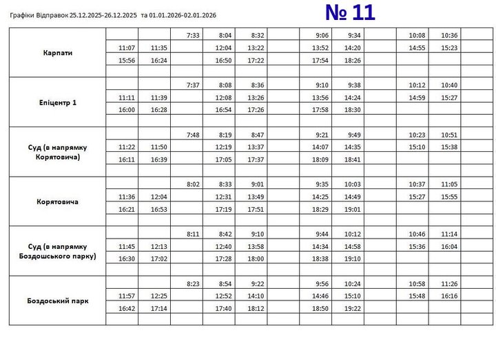 Графік маршруту №11 на 25-26 грудня та 1-2 січня. Ужгородська міська рада