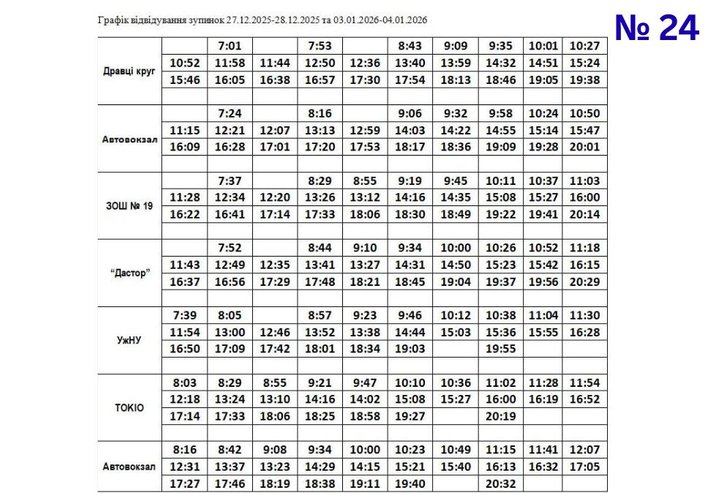 Графік маршруту №24 на 27-28 грудня та 3-4 січня. Ужгородська міська рада