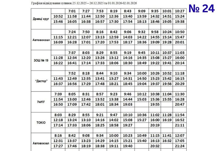 Графік маршруту №24 на 25-26 грудня та 1-2 січня. Ужгородська міська рада