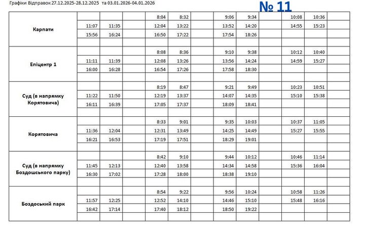 Графік маршруту №11 на 27-28 грудня та 3-4 січня. Ужгородська міська рада