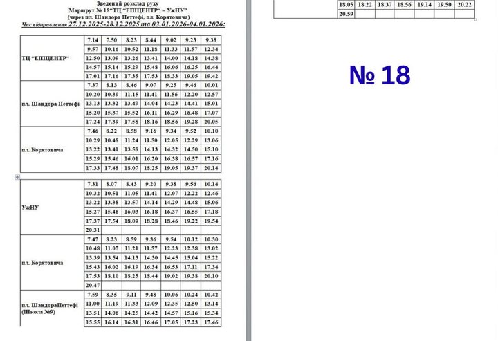 Графік маршруту №18 на 27-28 грудня та 3-4 січня. Ужгородська міська рада