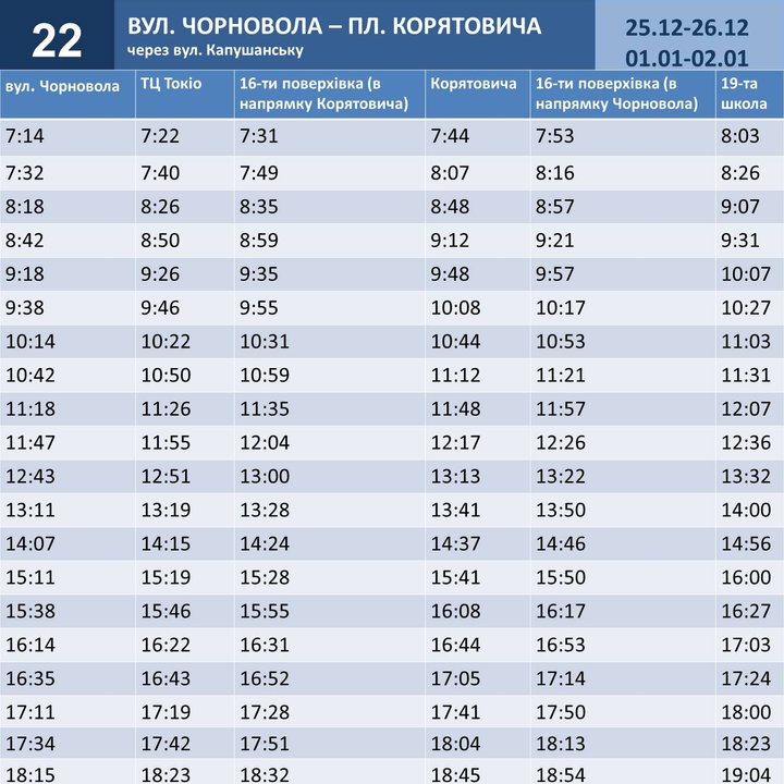 Графік маршруту №22 на 25-26 грудня та 1-2 січня. Ужгородська міська рада