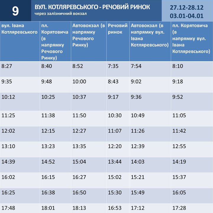 Графік маршруту №9 на 27-28 грудня та 3-4 січня. Ужгородська міська рада