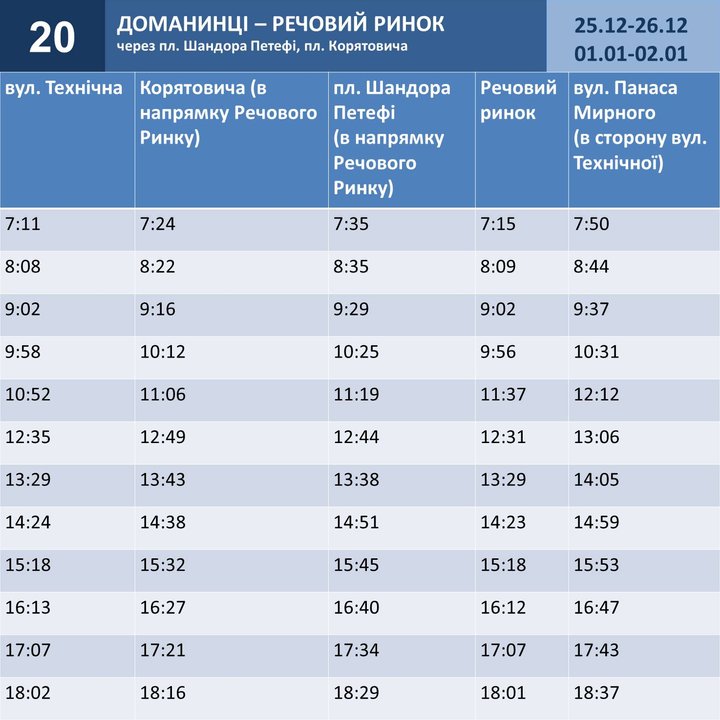 Графік маршруту №20 на 25-26 грудня та 1-2 січня. Ужгородська міська рада