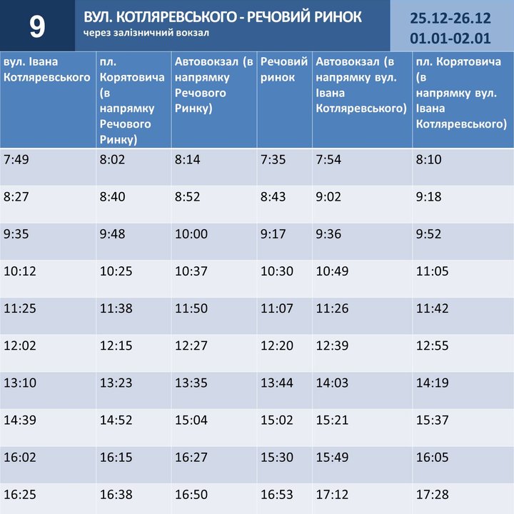 Графік маршруту №9 на 25-26 грудня та 1-2 січня. Ужгородська міська рада