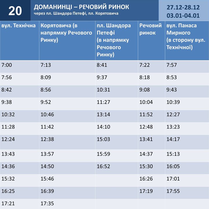Графік маршруту №20 на 27-28 грудня та 3-4 січня. Ужгородська міська рада