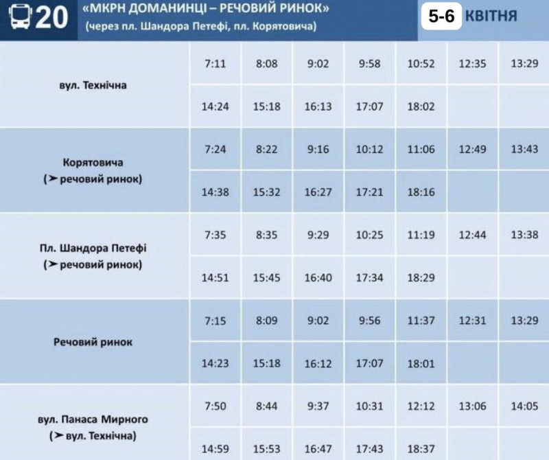 Графік руху маршруту №20 на 5-6 квітня. Ужгородська міська рада/Колаж:Суспільне Ужгород