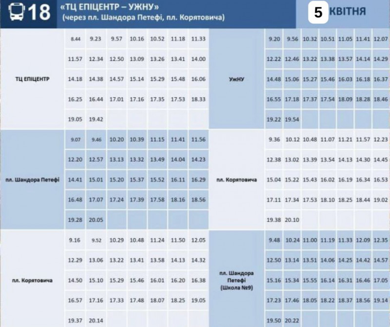 Графік руху маршруту №18 на 5 квітня. Ужгородська міська рада