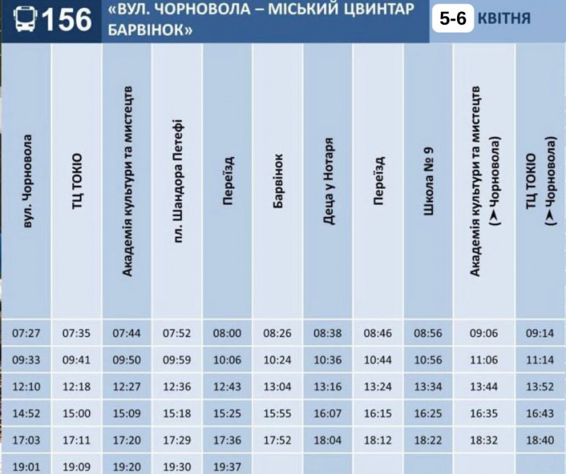 Графік руху маршруту №156 на 5-6 квітня. Ужгородська міська рада