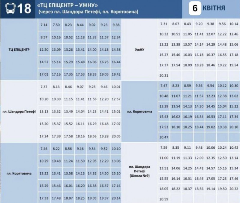 Графік руху маршруту №18 на 6 квітня. Ужгородська міська рада