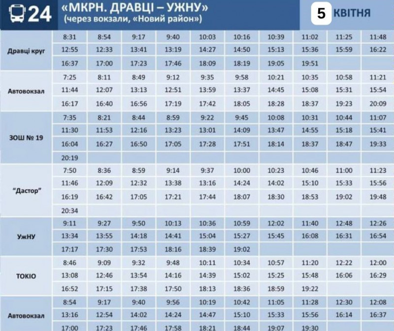Графік руху маршруту №24 на 5 квітня. Ужгородська міська рада