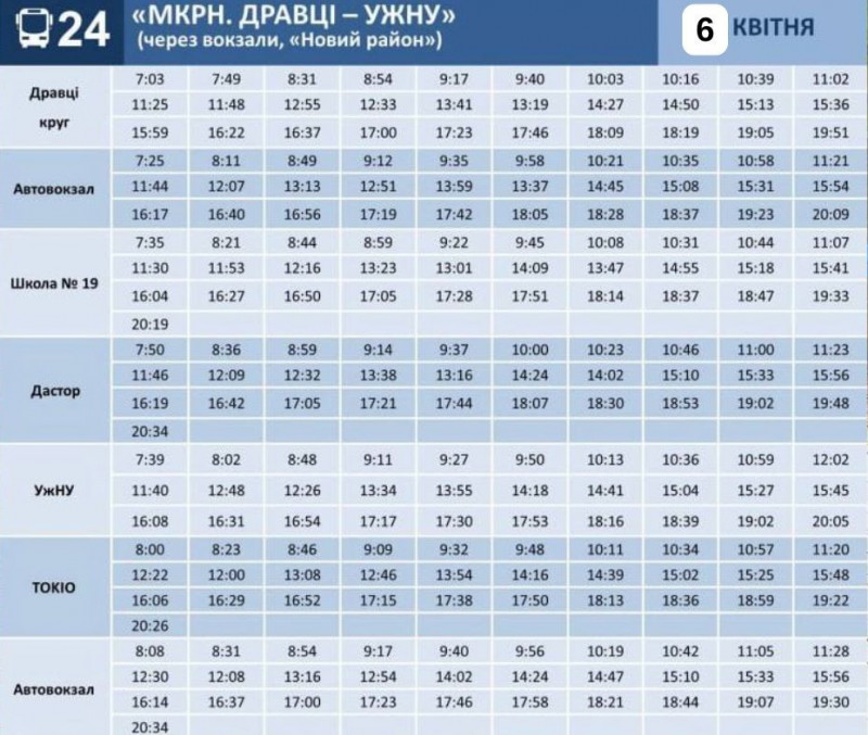 Графік руху маршруту №24 на 6 квітня. Ужгородська міська рада