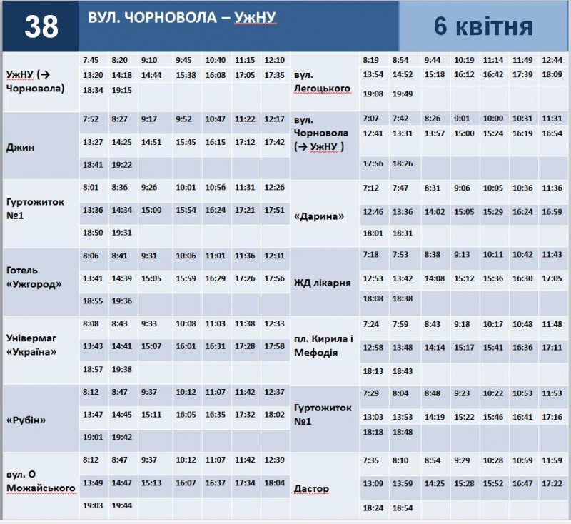 Графік руху маршруту №38 на 6 квітня. Ужгородська міська рада