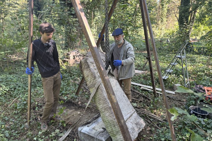 Реставратор Ян-Павло Роман і скульптор Василь Роман повертають на місце повалений надгробок на цвинтарі на Капушанській. Лариса Романюк/Суспільне Ужгород