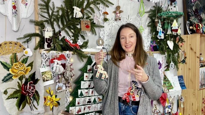 "Мотанка, наша традиційна українська, може бути не тільки з тканини. А ще й деревʼяна. І нашою родиною ми придумали ось такі дерев'яні вироби, прикраси ялинкові. Це і не кульки, ми їх назвали душкулі, душевні кулі, тому що вони, як і кожне наше життя, нерівне, не однакове, тому є такі в них грані. Вони з масиву дерева, всі ручної роботи, всі неповторні, тому що немає якоїсь однієї заготовки, за якою все висікається. Ні, вони кожна унікальна, до кожної підбирається окремий малюночок, як лягає, на яку грань".