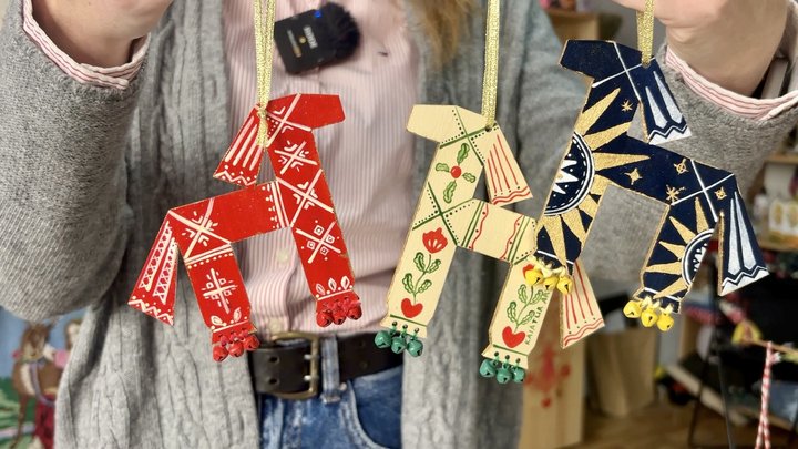 "Першою із цієї колекції іграшок стала коник-мотанка. Це інтерпретація моїх коників-мотанок. Захотілося щось дерев'яне, тому що дерево завжди для мене було цінним, тато працював в столярній майстерні й вдома теж багато майстрував. Ось такі коники-мотанки в трьох кольорах, різдвяна нічка, родинне дерево і класичний з українськими орнаментами".