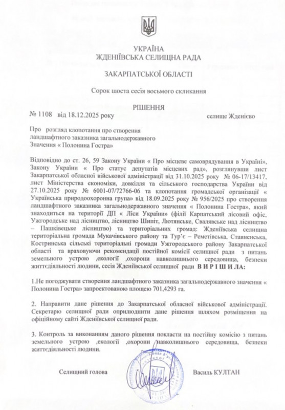 Рішення про відхилення клопотання про створення ландшафтного заказника загальнодержавного значення “Полонина Гостра”. Сайт Жденіївської селищної ради