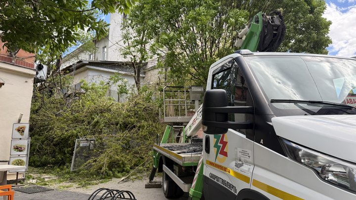 Поламані гілки дерев на вулиці Августина Волошина в Ужгороді, машина Закарпаттяобленерго. Руслана Гостюк/Суспільне Ужгород