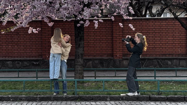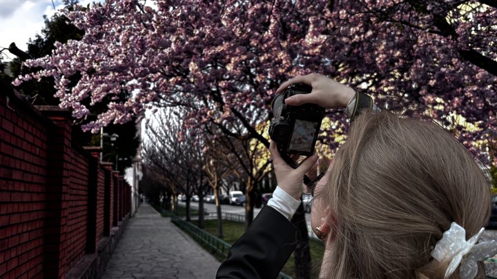 Фотографина Тетяна Самчук робить фото сакури у Мукачеві. Суспільне Ужгород/Міла Мороз