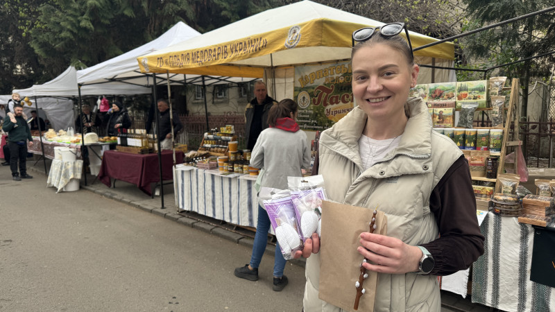 Переселенка з Нікополя Надія на ярмарку купила мед і сир: