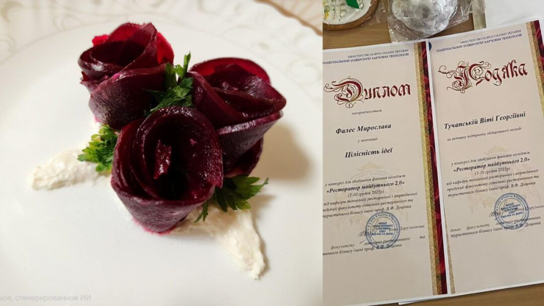 “Наш навчальний заклад гідно представила студентка 4 курсу групи ДВХ-221 Мирослава Фалес. Програма змагань була насиченою та вимагала глибоких знань: від складних тестів з технології виробництва до творчих завдань з організації обслуговування. Справжнім тріумфом Мирослави стала її авторська холодна закуска “Бурякова троянда”.