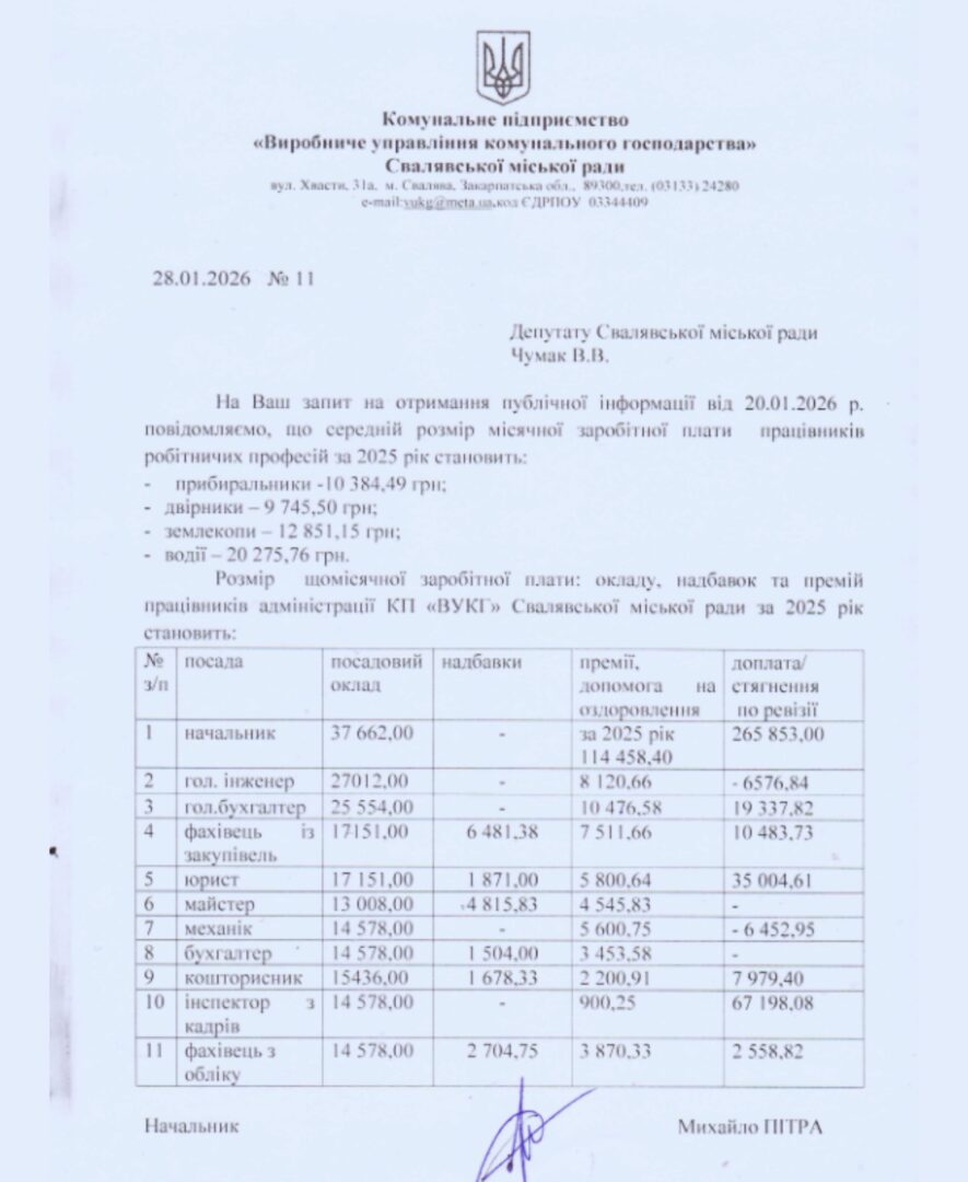 Депутат міськради Володимир Чумак отримав відповідь на запит щодо окладу, премій та надбавок, які були нараховані адміністрації та працівникам робітничих професій Свалявського “комуналу”.