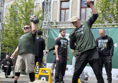 Учасники змагань “Карпатський виклик” виконують ривок гирі. Руслана Гостюк/Суспільне Ужгород"Проводимо ці змагання для ветеранів, це реабілітація, живе спілкування, обмін досвідом, повернення до цивільного життя", — розповідає Костянтин Кашула.