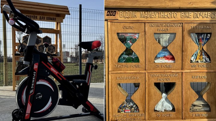 "Ви можете тут побачити над контейнерами для сортування електронне табло, яке буде від сьогодні вести відлік кількості відсортованих відходів, які принесли на цей екоострівець. Крім того, тут розташований велосипед, крутячи педалі якого можна заряджати мобільний телефон, або бачити, як світиться лампочка, щоб було видно, що справді виробляється електроенергія. Також на території облаштовані баскетбольні корзини, в яких дітки можуть тренуватися влучності, а також — спресувати тут на маленькому пресі алюмінієву банку і шляхом такої гри кидати відходи в ті контейнери, де вони мають бути розташовані", — розповіла Наталія Якубик.