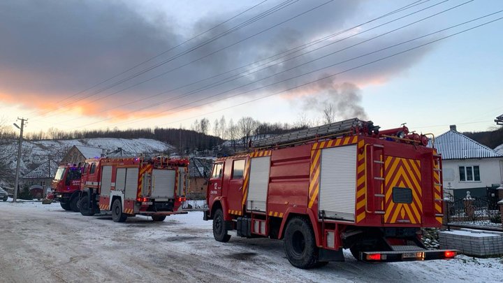 Пожежні машини, залучені до гасіння пожежі в селі Росош. ДСНС у Закарпатській області