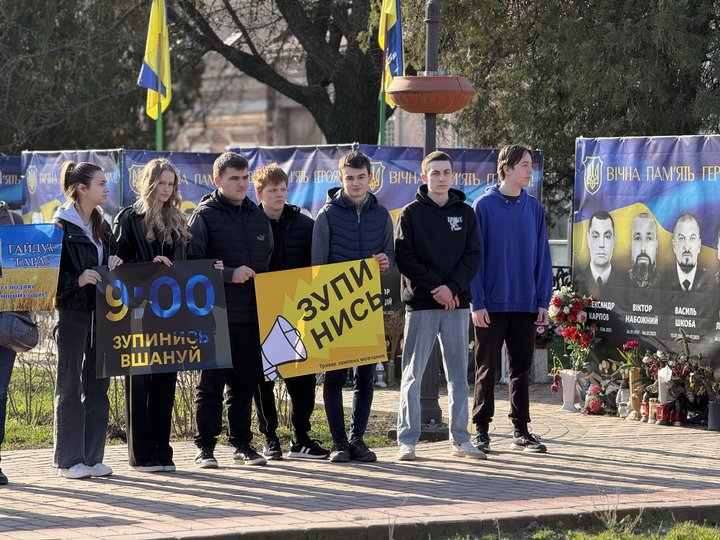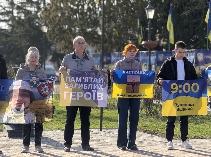 В Ужгороді родичі полеглих захисників, військові та школярі провели акцію-нагадування про хвилину мовчання.
