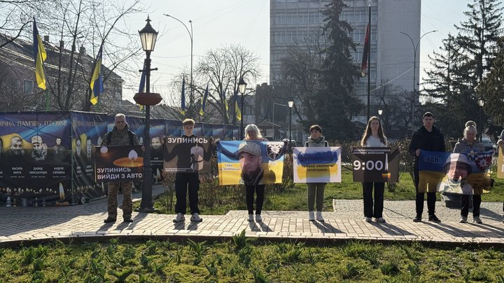 Учасники зібралися у сквері на площі Шандора Петефі, тримали плакати з гаслами "Зупинись", "Памʼятай загиблих героїв".